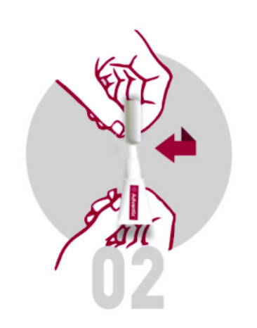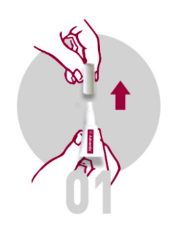 Kapicu treba okrenuti naopako i njen drugi kraj staviti na vrh pipete. Kapicu treba zaokrenuti tako da se probuši plastična membrana na vrhu pipete.
