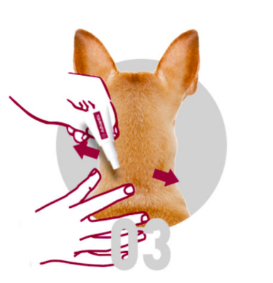 Raširite dlake na životinji između lopatica tako da koža bude izravno izložena. Pipetu postavite na kožu i pritisnite je. Ovisno o veličini psa, ispraznite i rasporedite sadržaj pipete na 1 do 4 mjesta. Obvezno uklonite glavu pipete s kože prije nego što je otpustite kako biste spriječili povratni protok.